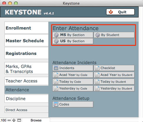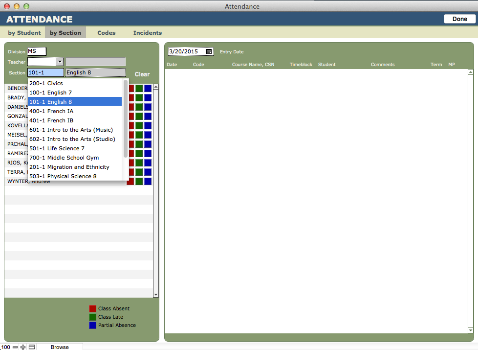 Depending upon your entry point, the Attendance interface will open ready to accept your selections. In this case, the pull-down menu is populated with sections from the MS division.