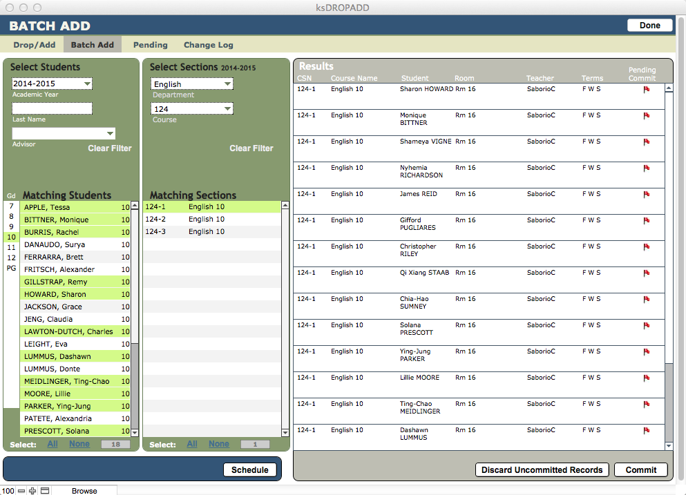 - Click Schedule to schedule the group as a batch. Individual registrations can be edited from this list, or from Drop/Add.