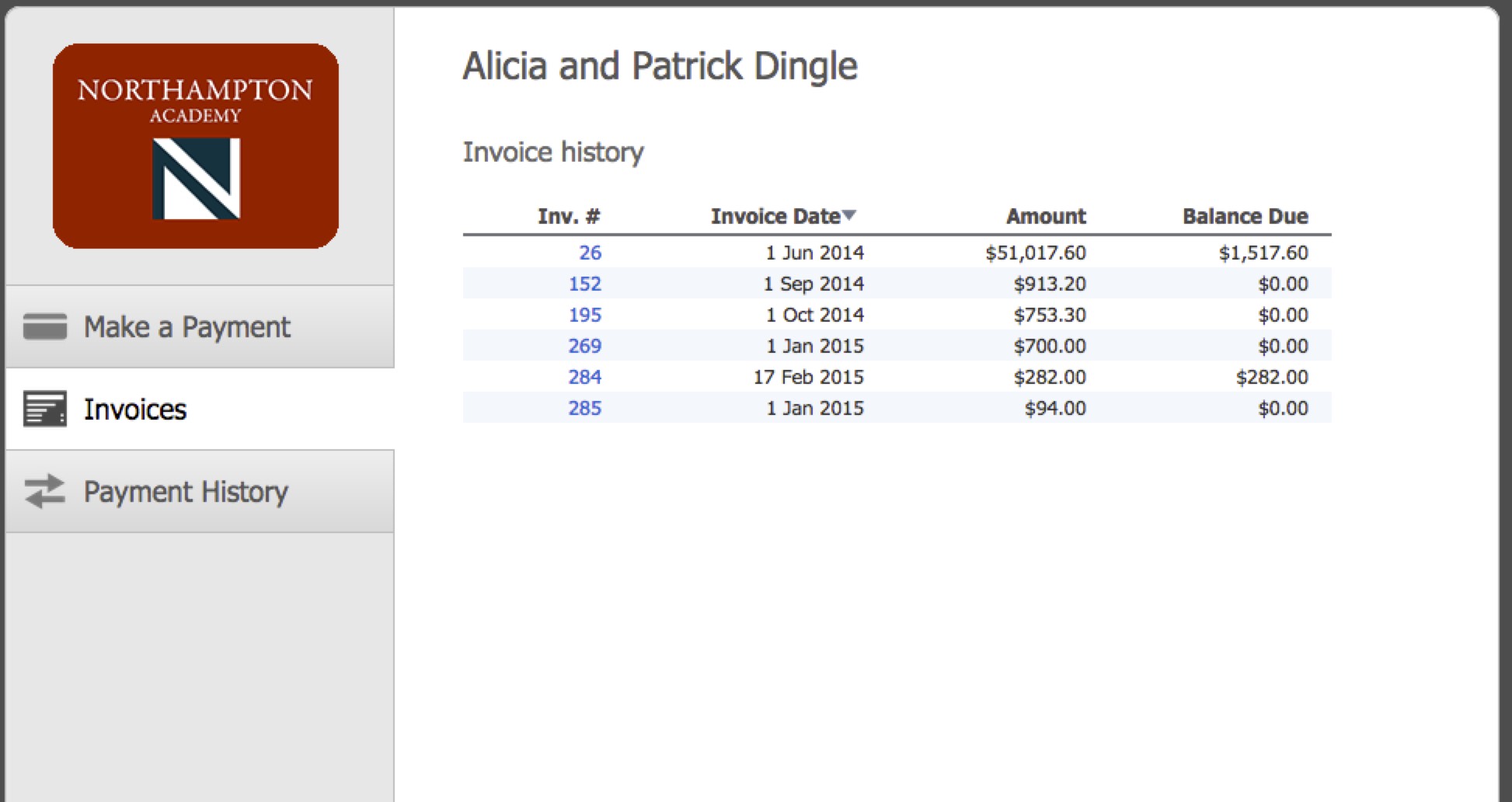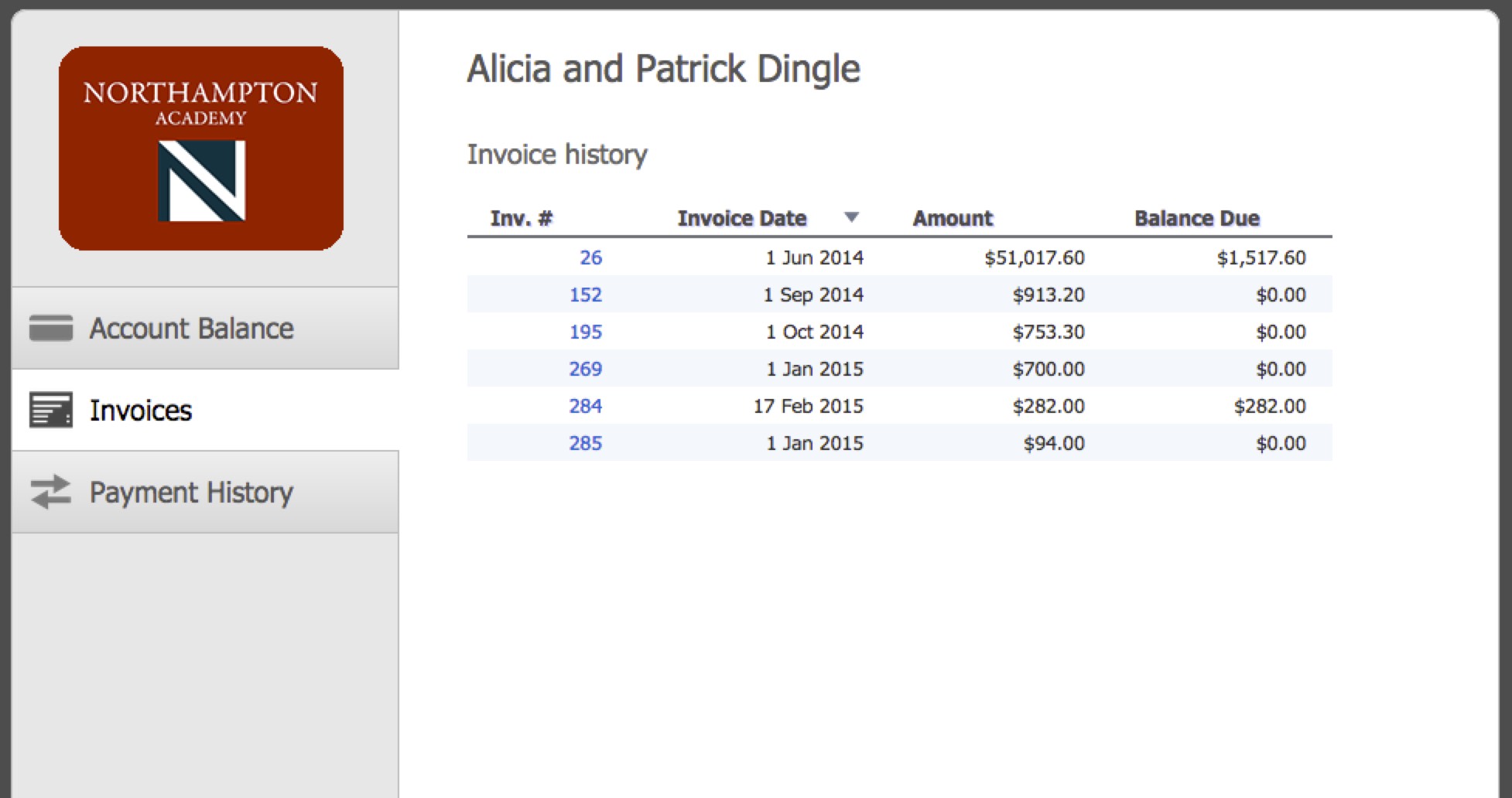 The school displays billing information only (no payments)