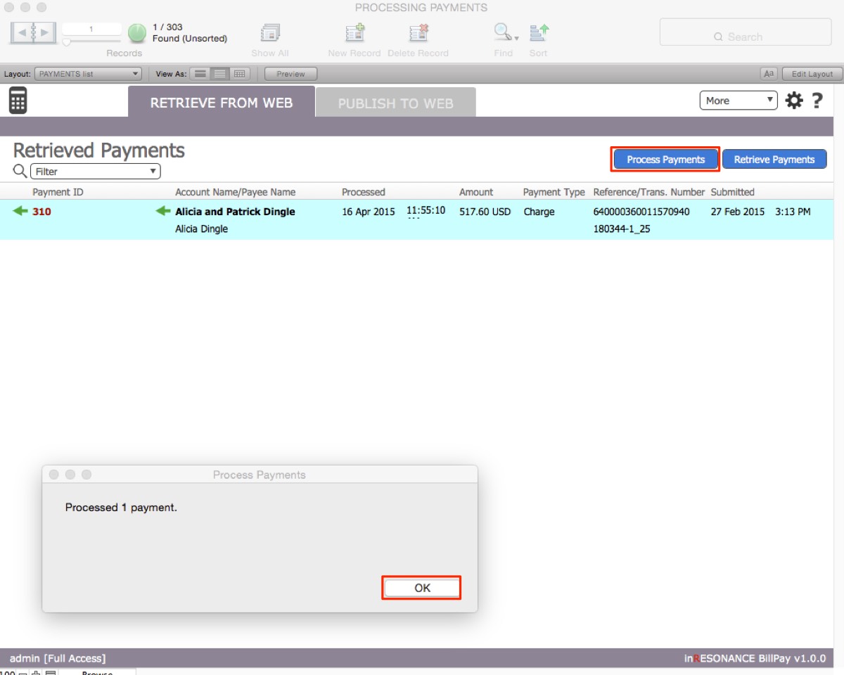 - Click the button Process Payments.