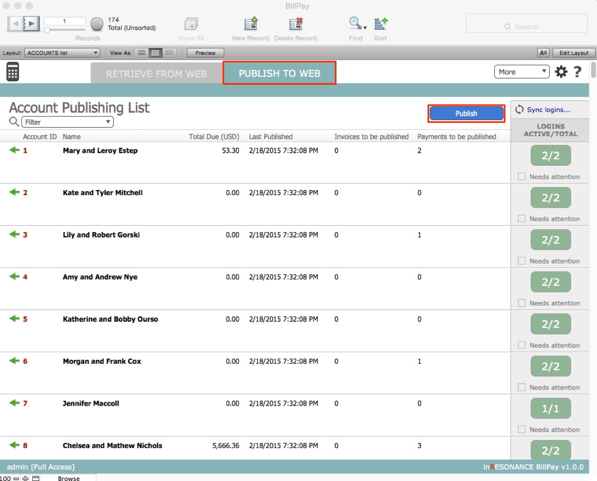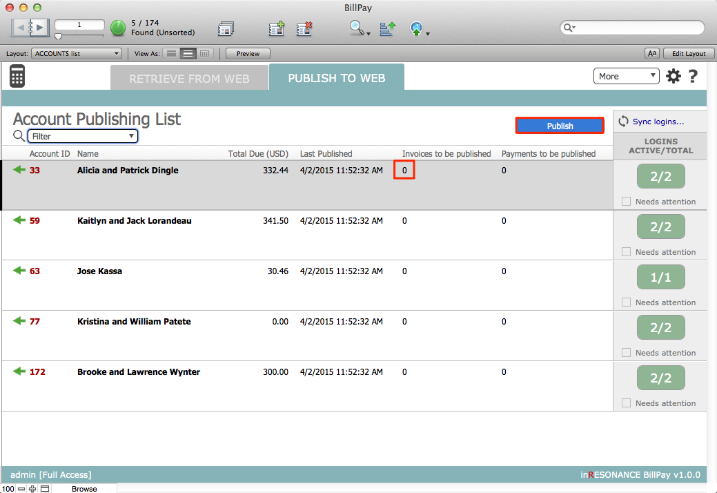 - In Publish to Web, on the Account Publishing List, BillPay displays records with data that has not been published. Unpublished data includes invoices and payments. There is a count displayed for each record in the list.