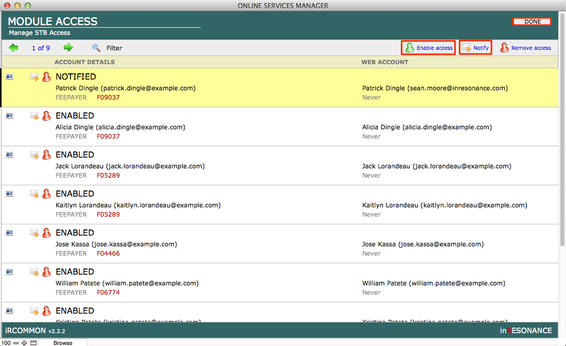 - If you wish to send an email to the account(s), click Notify. The iR Common system is intelligent about which email will be sent to each account: If they already have an account for other iR web services (SFO, or FAM, for example), they get a reminder email. If this is their first web services account, they will get a new account notification.