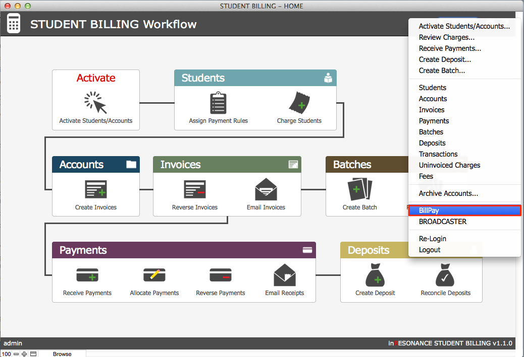 The Student Billing admin will perform daily workflow tasks in the BillPay FileMaker interface: