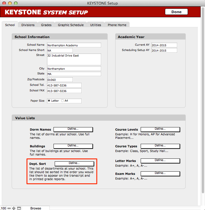 - In the School tab, click Define next to the label Dept. Sort at the bottom left side of the screen.