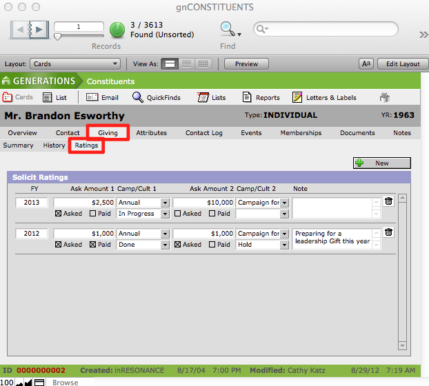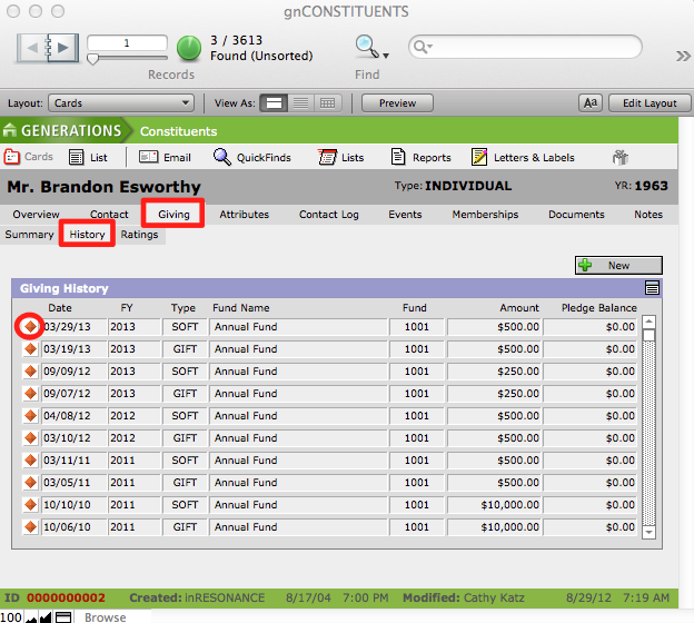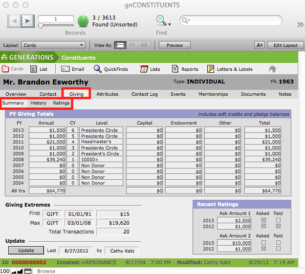 While individual transactions are managed in the Giving section of GENERATIONS 3.x, an overview of the giving history and prospect ratings of a constituent are on display in Constituents > Giving tab. The Giving tab has three sub-tabs: Summary, History, and Ratings.