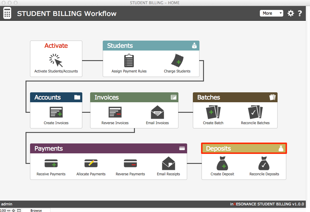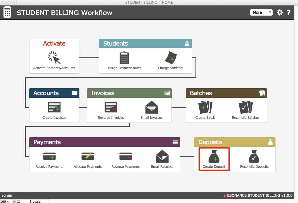 - From the Student Billing Workflow screen, click on the Deposits color bar to enter the Deposits domain.