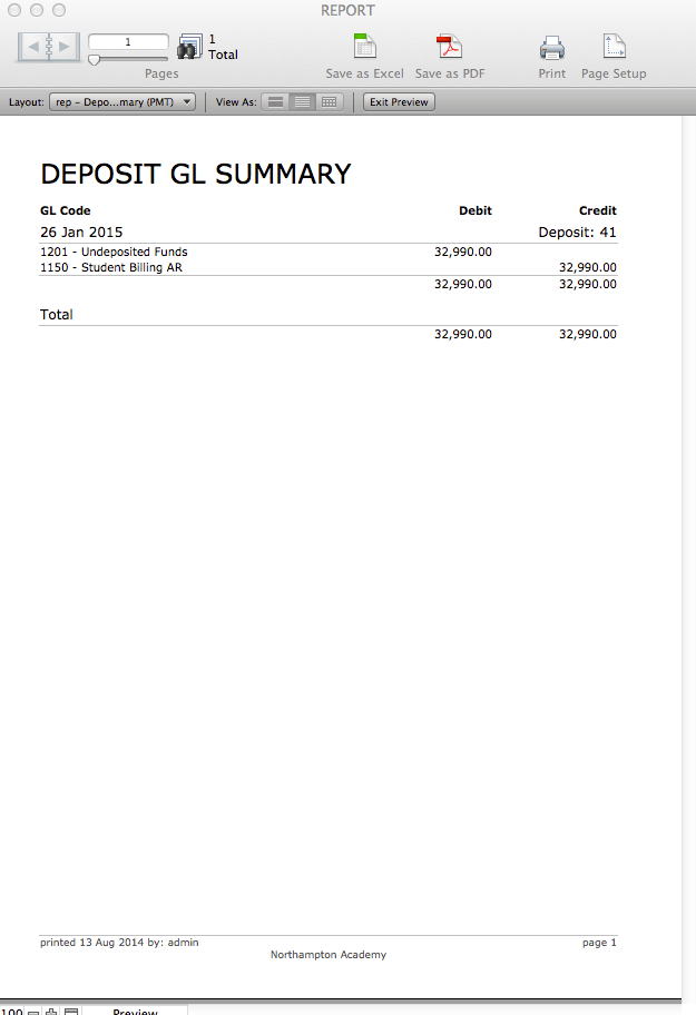 For accounting purposes, you will want to export a GL Summary Report of Deposits. The GL Summary Report can be run for a single deposit or a found set of deposits.