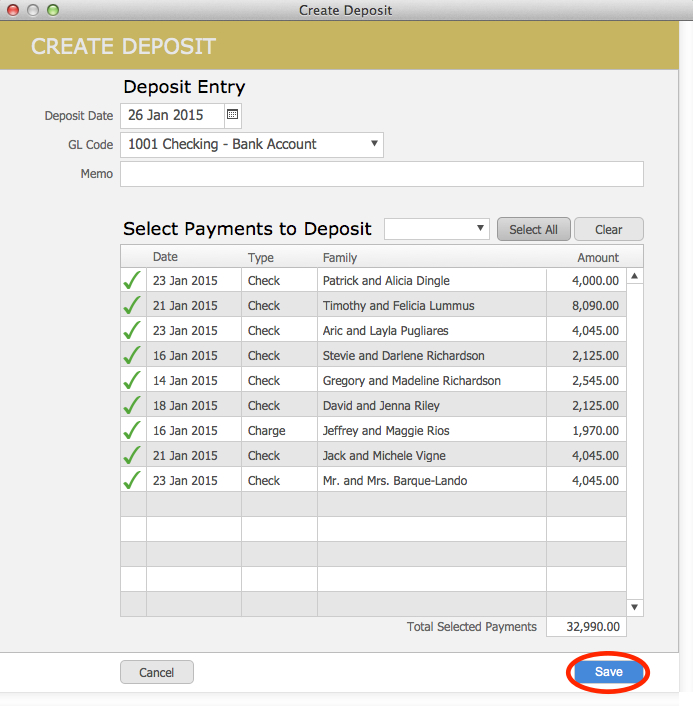 - You may select only one certain type of payment to deposit, or Select All using the button above the list. Alternatively, click the checkmarks next to payments you wish to deposit. A total at the bottom of the screen will show you the deposit of payments selected for this deposit.
