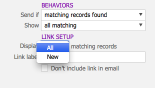 - Within the Display drop down menu, select “All” or “New” matching records, depending on what value set you would like your link to reflect.