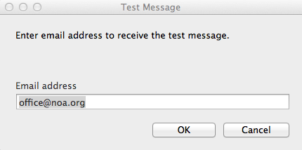 - Click the Test Alert button to send a test email. Enter an email address into the pop-up box that appears and click OK. A test email will be sent to that email address. A default test email address may be setup in Preferences.