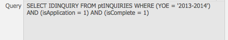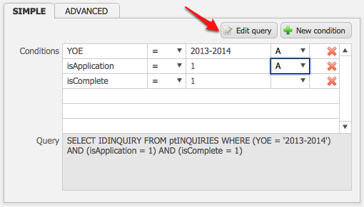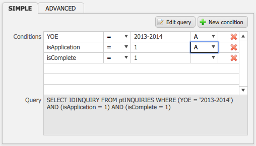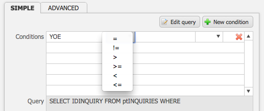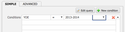 - Enter the second relational field name into the third box on the row.For example, if you want your YOE to be 2013-2014, your conditions would be “YOE, =, 2013-2014“. If you wanted your YOE to be all the years prior to 2013-2014, your conditions would be “YOE, <, 2013-2014“.