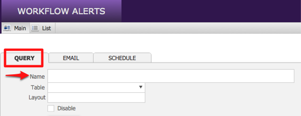 - On the Query tab, enter a name for your alert into the Name field. This is how it will appear in your list of alerts. You will be able to set the message name for the person receiving the alert on the Email tab.
