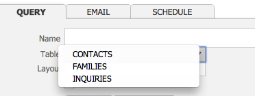 - Select CONTACTS, FAMILIES or INQUIRIES from the Table drop-down menu to designate which file in PORTAL will be the source of the information you are using to form your alert.