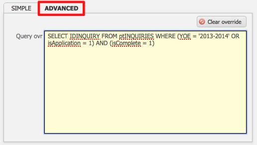 The Advanced tab displays the Query override option field. This is for advanced users only and should be left alone.