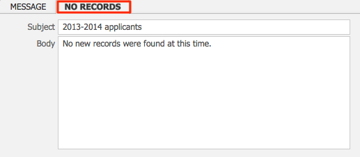 - In the No Records tab, enter a Subject and text Body for the alert that will be sent if there are no new records found in the time period specified by the alert.For example, if your alert checks for new information every hour and there are 3 hours in which no records appear in the system, then the No Records alert email will be sent out for each of those 3 hours.