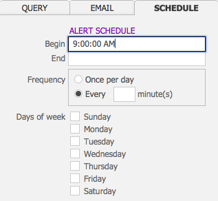 - Enter a time of day into the Begin field, using a XX:XX:XX AM/PM format, when you’d like the alerts to begin.