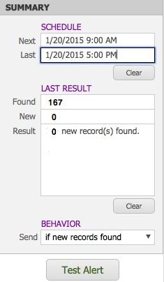 - In the Last Result fields, the Found field displays the total number of records found that match your desired conditions. The New field displays the number of new records since the last alert was run.