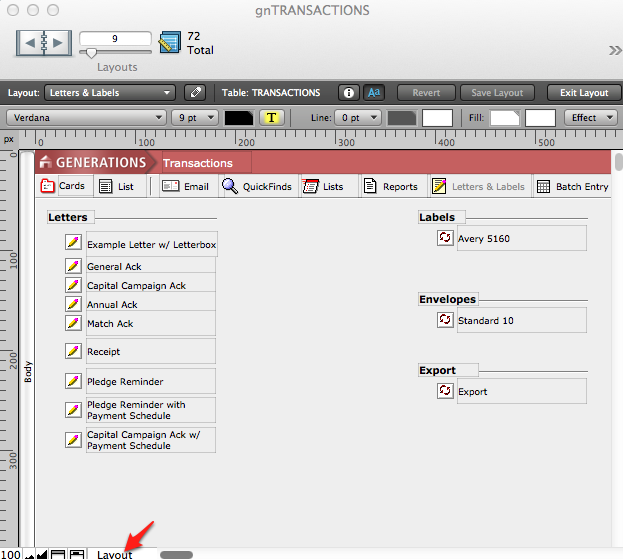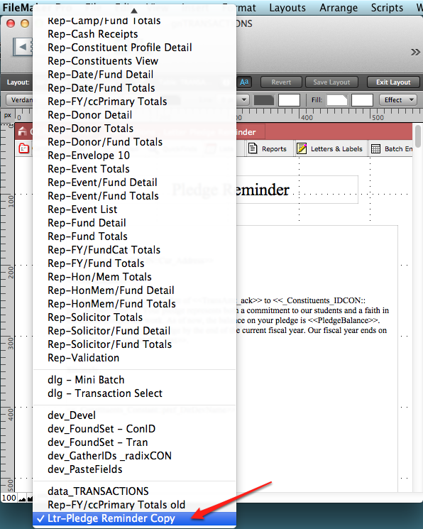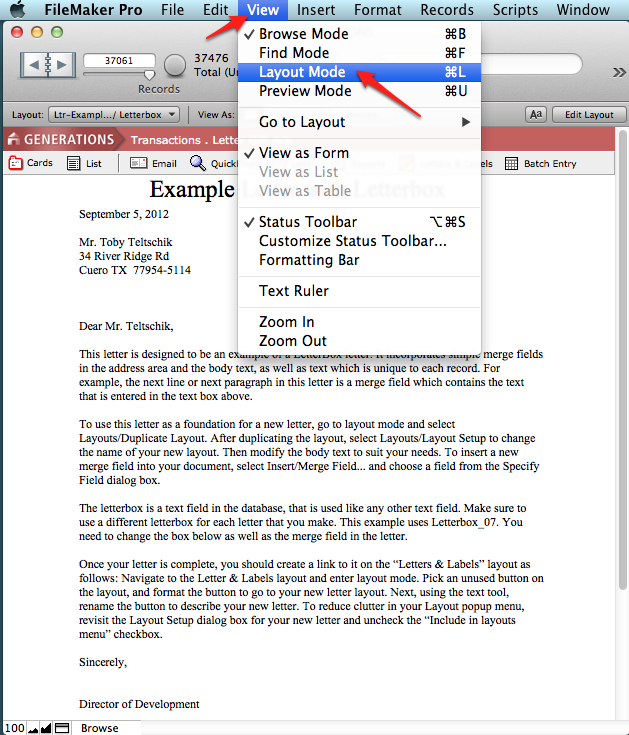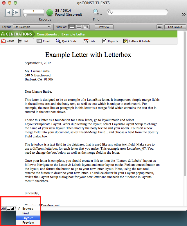 Switch to Browse mode and click on the Layout menu. Notice that your new letter does not display in the menu while in Browse mode. If you do not attach your letter to the Letters & Labels screen, you will have to switch to Layout mode to navigate to it.