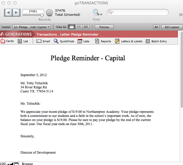 - Switch to Browse mode and flip through the records one at a time, using the Book in the status area, to verify that your letters are formatted correctly. If letters are missing merged data or data display is incorrect, you will need to determine if the error is due to an incorrect merge field, or errors with the data in the constituent record.