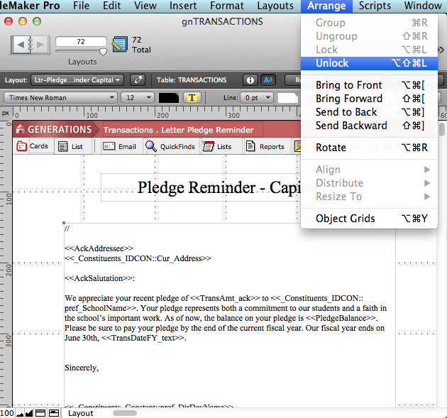 - Make sure your button is selected and choose Unlock from the FileMaker Pro Arrange menu. The handles will turn black when they become unlocked. If your button is already unlocked, Unlock will not be an option you can choose.