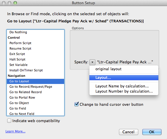 - Click the Specify pull-down menu in the Options area on the right side of the dialog box. A list of all the layouts in the file will appear. In the next step, you will tell FileMaker Pro where the button should navigate the user when pressed.