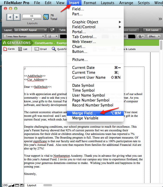 - Select Merge Field from the FileMaker Pro Insert menu at the top of your screen.