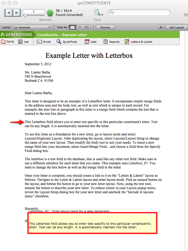 To see the power of this technique, switch back to Browse mode. In any record, click into the yellow Letterbox field at the bottom of the screen. Press return twice to insert a blank line and type some text. Tab out of the field. The text you typed will appear in the letter body where the merged field is placed.