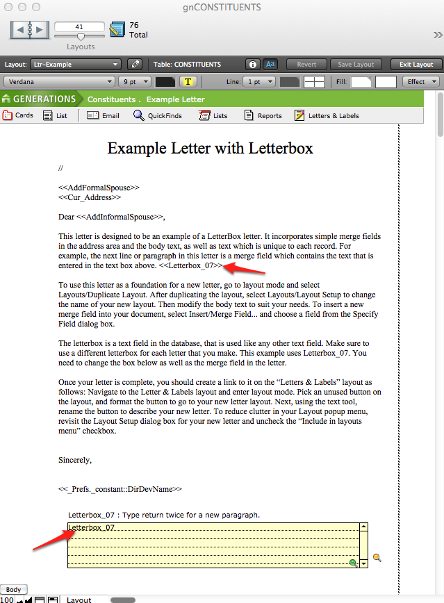 - Using the Text tool, edit the merged Letterbox_07 field in the body of the letter. Type into the field name and change the _07 to _01. Remember not to delete the chevrons or the hyphen or to add spaces. You may have to unlock the field Text Object first. Recall that there are eight Letterbox fields in GENERATIONS. Letterbox_07 is used for the sample letter and cannot be used for any other letter.