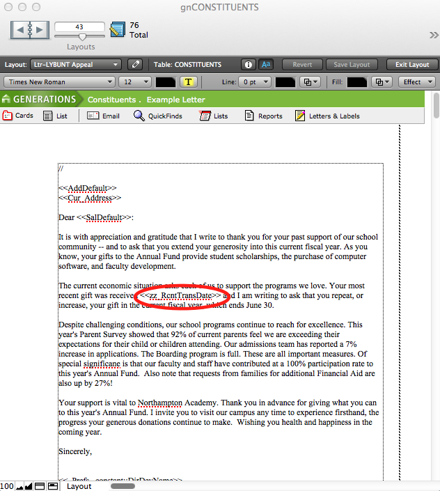You can use almost any field in GENERATIONS as a merge field in your letters. This means each letter for each individual in your found set, will display data from that individual’s record. So the core of the letter will be the same for eavery constituent, but the details in each letter will pertain to the addressee.