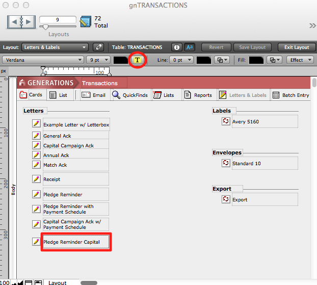 Letters in GENERATIONS may be linked to the Letters & Labels screen. A letter that will be used frequently may belong on the Letters & Labels screen, but most letters should not be placed here. You can always navigate to all of your letters by entering Layout mode and clicking on the Layouts drop-down menu.