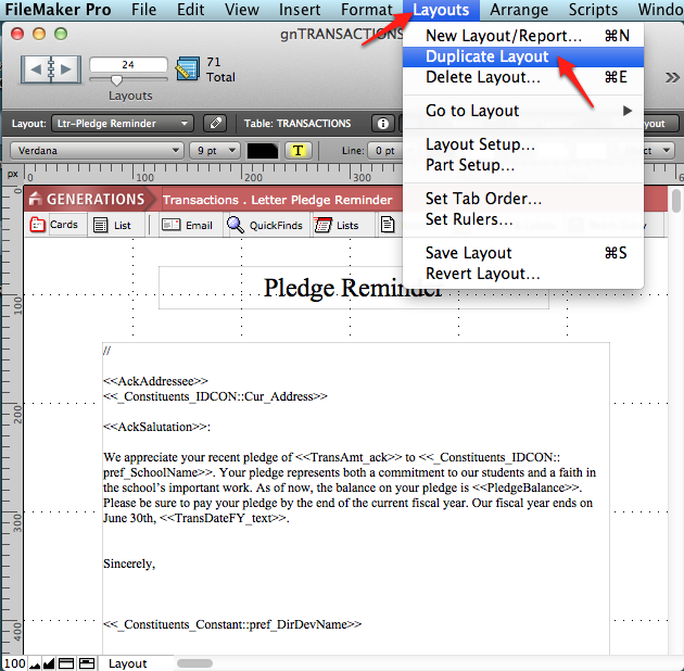 - Select Duplicate Layout from the FileMaker Pro Layouts menu. You may not notice anything new but the existing layout has been duplicated and renamed with the original name and the word copy appended to it.