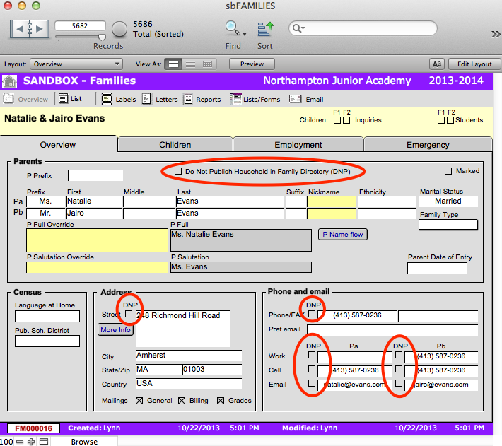 Sometimes a family will not want all or some of their personal information published in the family directory. SANDBOX allows the school to control which aspects of the family’s information is published. Note that the default is for all family information to be published, so Do Not Publish orders (DNP) must be applied manually to a family record.