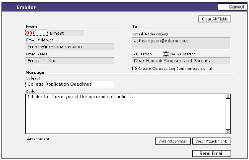 Email can be sent to groups of students and their parents as well as college contacts. Email messages that are sent using Email have the same heading and body for everyone in the found set, but contain unique salutations for each person.