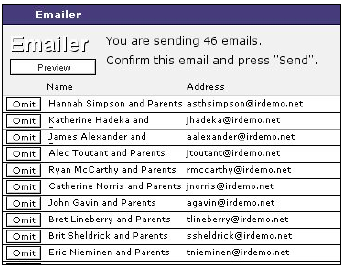 A list will appear displaying the names of everyone in the found set to whom you selected to send the email. You are able to omit anyone from the list by clicking on the Omit button located beside his or her name.