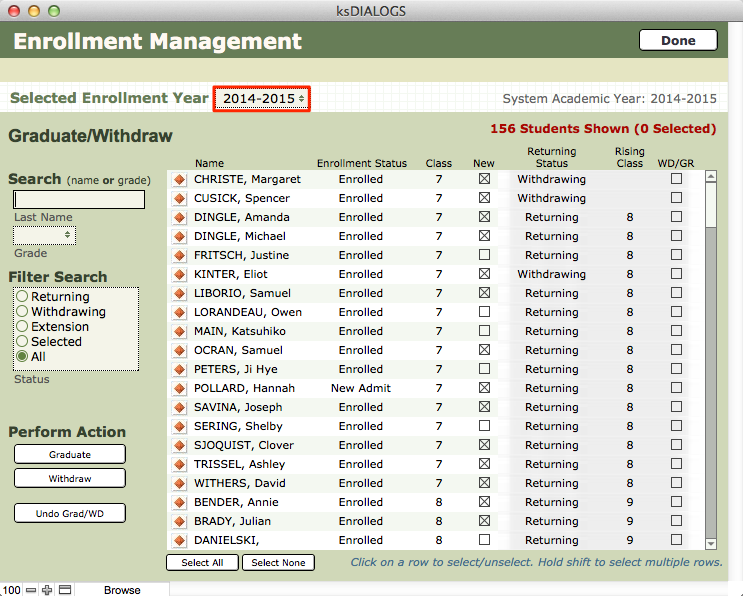 - The Graduate/Withdraw screen will open. Before you begin, verify that the selected enrollment year is the academic year from which you are graduating/withdrawing students.