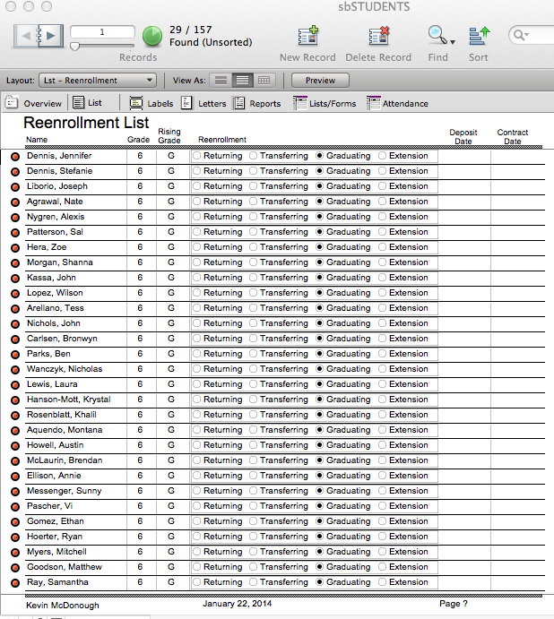 - Look through the found set and omit any records for students who are not graduating by clicking in the name field and selecting Omit Record from the Records menu at the top of your screen. These students will remain in their current grade.