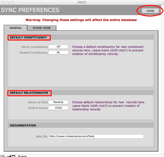 - Check the Default Constituency and the Default Relationships settings. The Sync file will automatically create relationships when you import new parents. Then click Done.