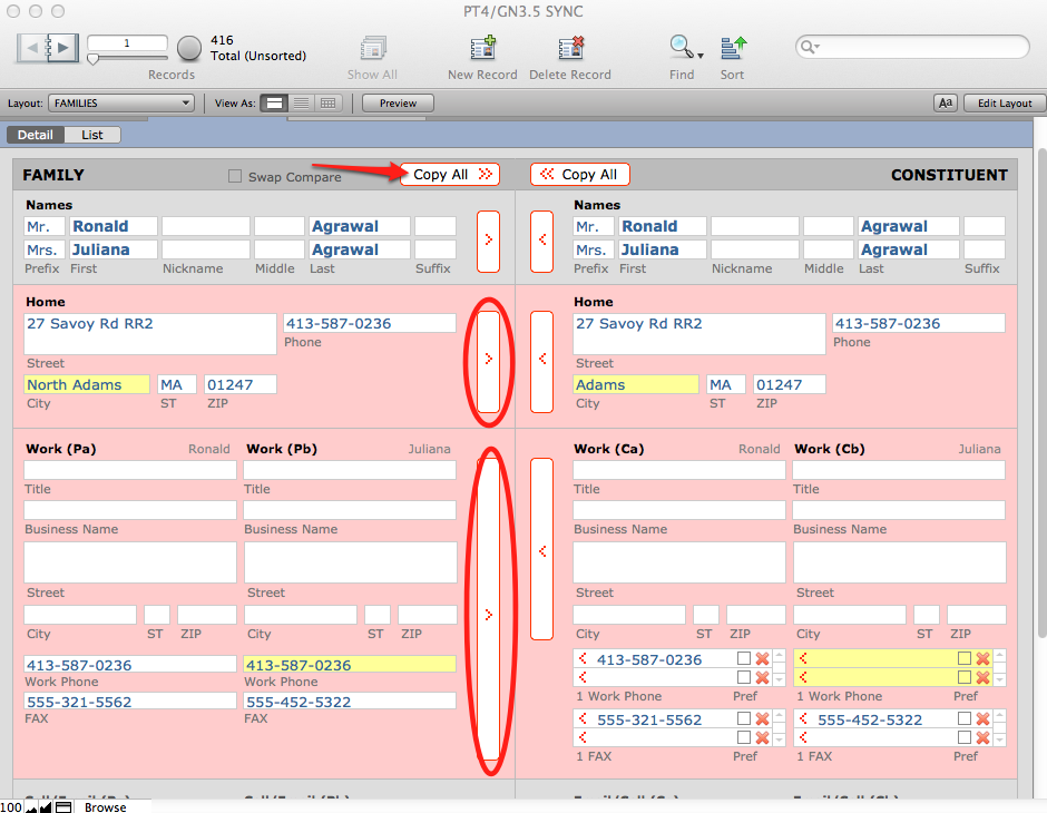 When you sync files between PORTAL and GENERATIONS, you may find when you look at the two files side-by-side, some data is different. Sync allows you to see both files side-by-side and overwrite old data with new data in either direction.