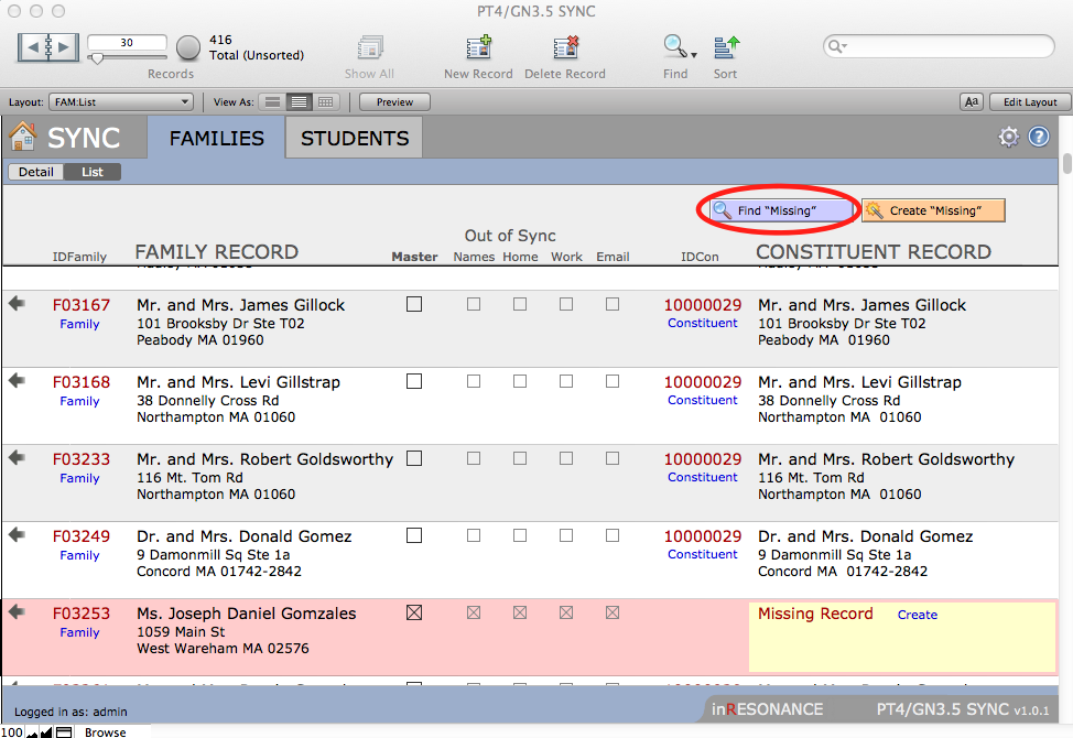 - Create records for the Missing families by clicking on the button “Create “Missing”.