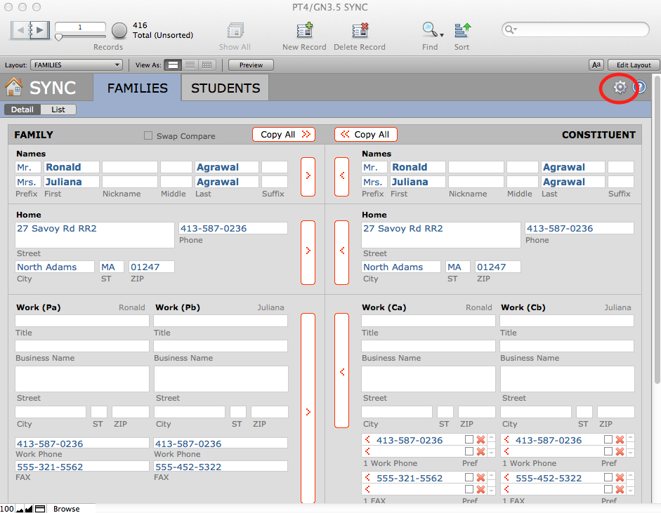 - When you bring students in, you may want to keep them in sync with their families until such time as they move and have their own mailing addresses. At this time, you will track them as individuals, and their records will not be sync’ed. When you delete a record in the Sync file, it does not delete the student record, nor does it delete the constituent record. It deletes only the sync record. You can delete a record by using the Delete Record button in the status area, or from Records menu > Delete Record.