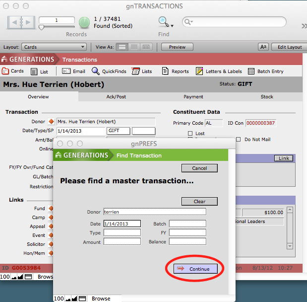 Transactions can be linked to one another—such as linking a gift to a pledge—from the Overview screen in the Transactions file.