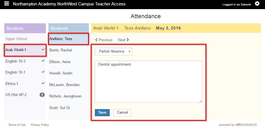 hamburger dropdown menu. - Select the Section. The students in that section will appear int he students column. Existing attendance notes will appear as note icons in the attendance chart.