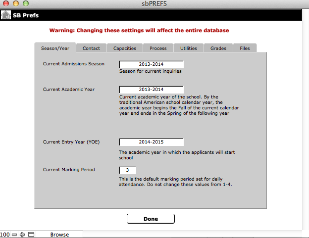 After completing all other end of the year procedures, it is necessary to change the preference settings in sbPREFS to reflect the Current Admissions SeasonCurrent Academic Year, and Current Entry Year. This will set the default for new inquiries and will set the current year for records in the sbSTUDENTS file.