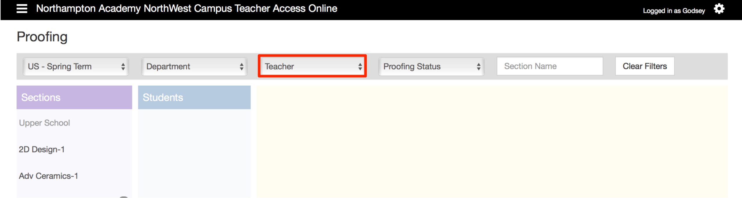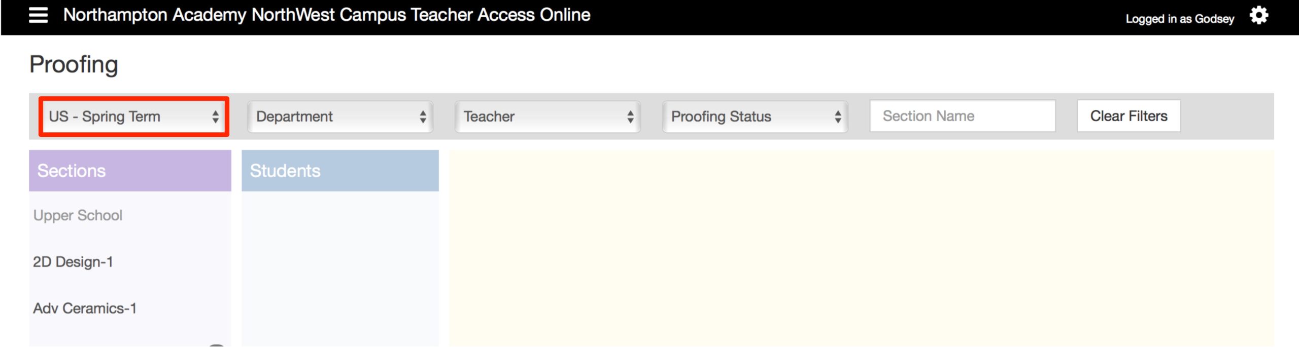 To find the student’s that you need to proof for you first need to filter from the dropdown menus. You may filter by term, department, teacher name, and proofing status.