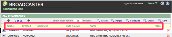 The list of broadcasts is organized in columns, which include: