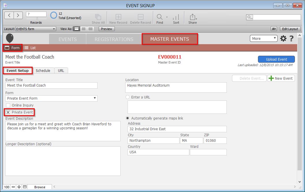 - Click the blue Upload Event button to commit your changes.
