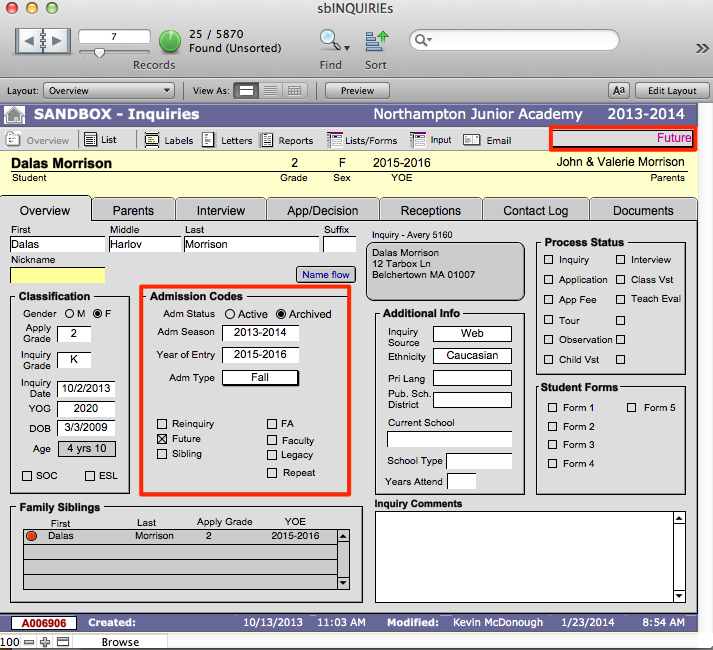 - Navigate back to sbINQUIRIES > Overview. Notice that the inquiry record now appears with Future marked in the Admission Codes section.