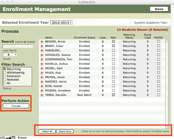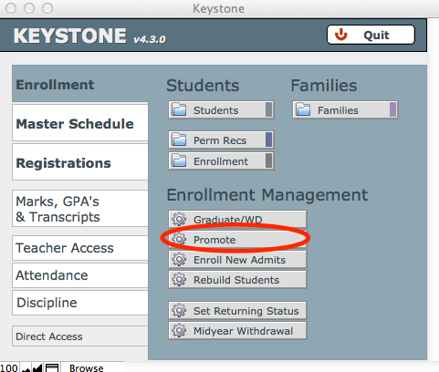 - The Promote screen will open. Before you begin, verify that the selected enrollment year is the current academic year.