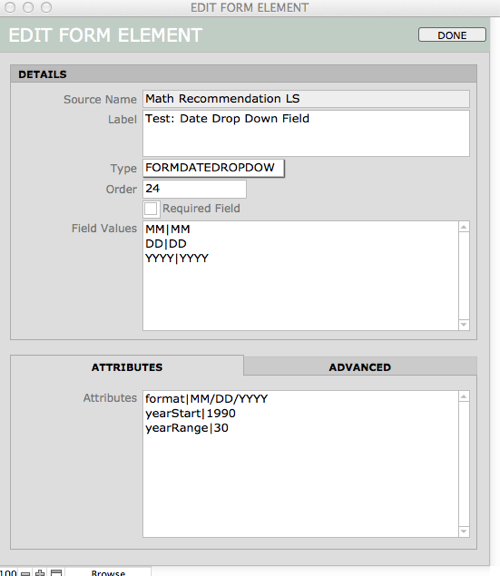 - Attributes – These define the formatting of the element as it displays on the form. When you create an element, attributes may pre-populate as default settings in the Edit Element window.