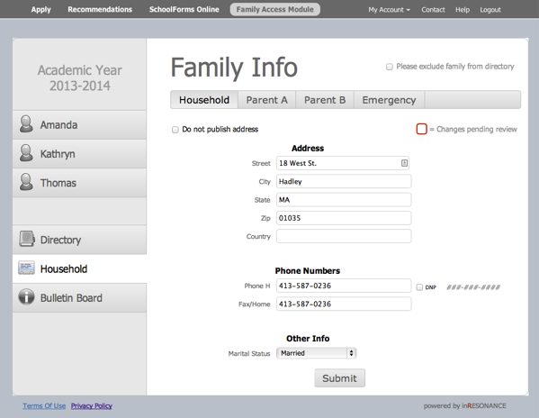 NOTE: When a family makes a change to their data in their web account (Household tab), a red line appears around the changed data; this red line indicates that their data change is in process. Once the office processes the data change (as outlined above), and clicks Publish changes, the red outline no longer displays in their account.